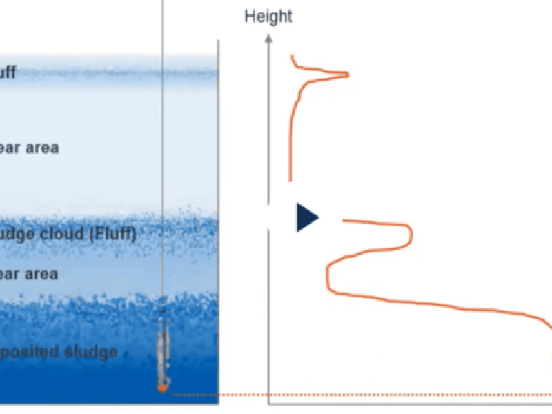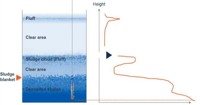 Sistema de medição de nível do manto de lodo, com a tecnologia de monitoramento dos perfis de sedimentação. Usando um sensor óptico que viaja até o fundo do tanque, ele detecta todas as fases do lodo, fornecendo medições precisas de concentração e nível. Dessa forma, ele também é capaz de medir a manta de lodo continuamente (rastreamento de zona) e, portanto, monitorar uma "zona" específica (por exemplo, para controlar as bombas durante o desbombeamento do lodo). Para um monitoramento de processo otimizado, uma mudança automática do modo de medição é possível, na qual as medições do perfil de sedimentação podem ser realizadas nesse meio tempo. Ao contrário dos medidores de nível de lodo ultrassônicos, não há retornos de eco das paredes do tanque ou amortecimento de sinal ou lodo flutuante que podem causar medições falsas.